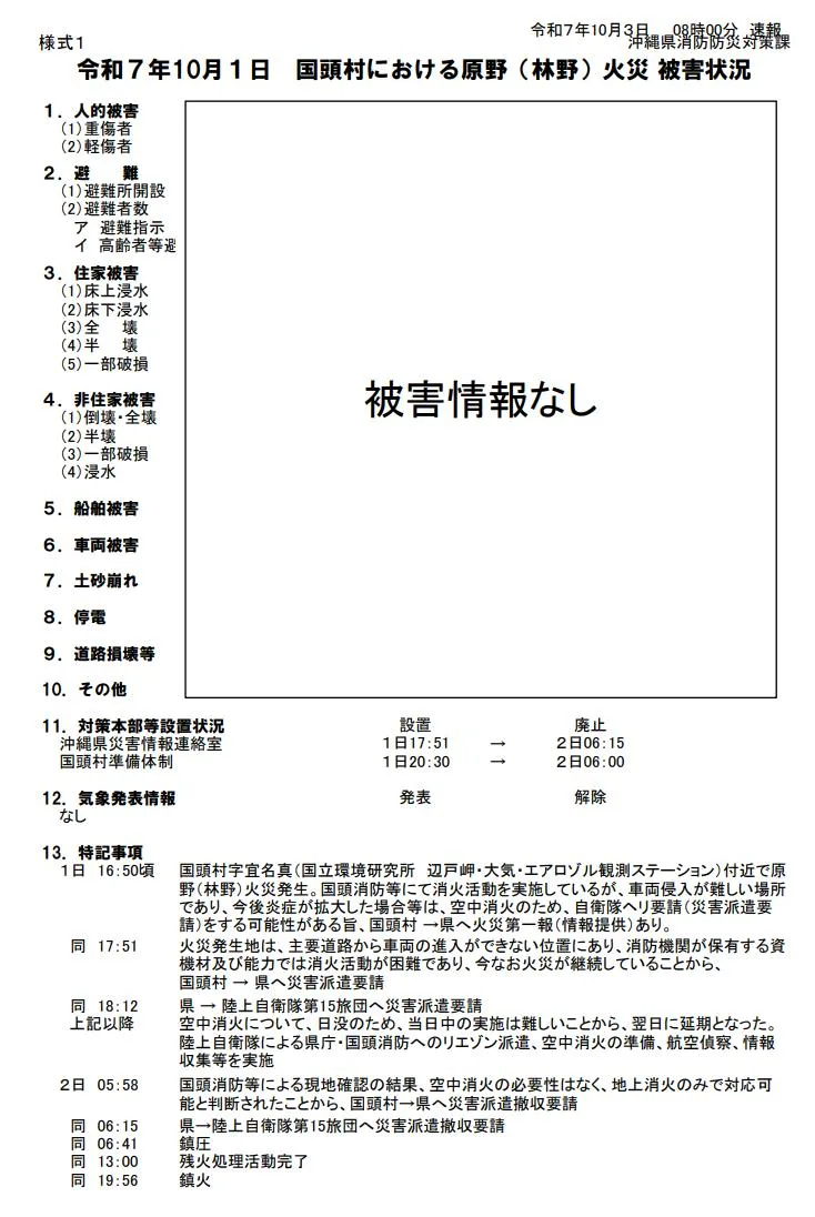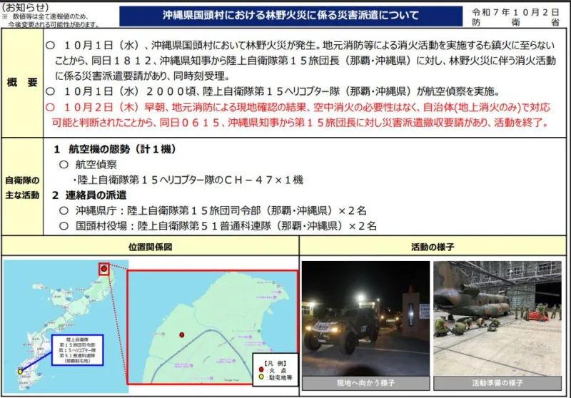 - 要請と派遣内容: 10月1日 18:12に沖縄県知事から第15旅団へ消防活動支援の災害派遣要請。