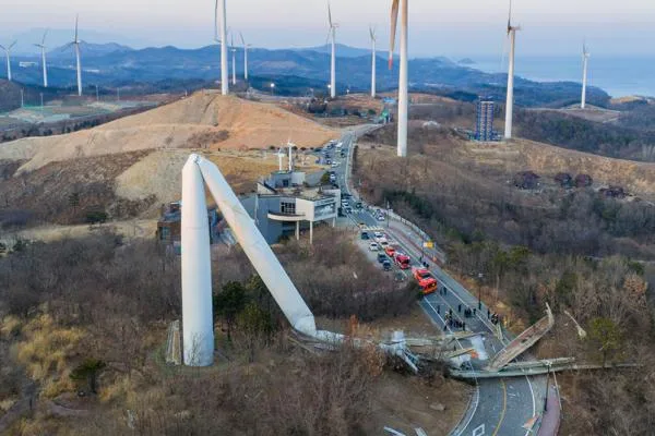 2日午後4時40分頃、盈徳郡昌浦里の別パラン公園内にある風力発電団地で、高さ80メートルの風力発電機の支柱の中間部分が折れ、支柱とブレードが公園内の道路に倒れ込んだ。ちょうど公園内の展示館が休館中で車両の通行が少なかったため、幸いにも人的被害は発生しなかった。
