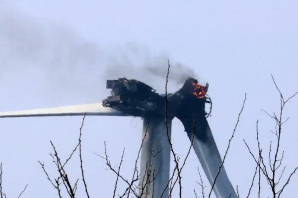 この事件の発生で、慌てて運用停止になっていた風力発電機だったのだが、1ヶ月後にブレードが折れて火が出ている。悪いことに、これが点検修理中のものだった。