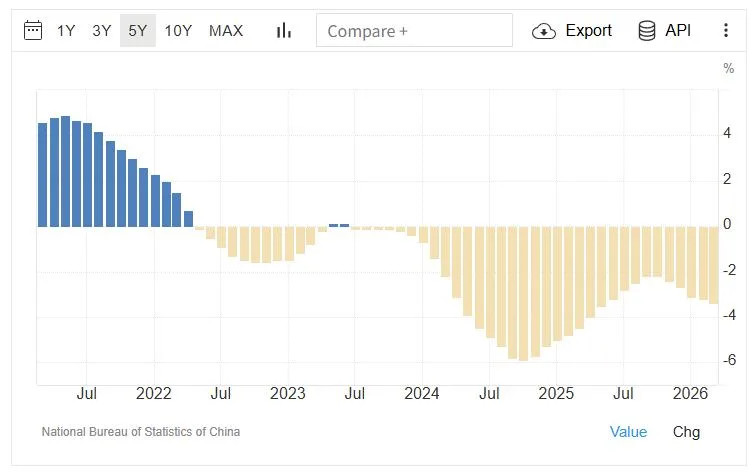 2026年3月、中国の70都市における新築住宅価格は前年同月比で3.4%下落し、前月の3.2%の減少から拡大しました。この最新の数値は、33ヶ月連続の縮小を示しており、2025年5月以来の最も急激な下落を記録しました。これは、不動産セクターの持続的な弱さを浮き彫りにしています。このデータは、政策立案者が住宅市場を安定させるために苦労していることを強調しており、彼らは依然として回復をもたらしていない段階的かつターゲットを絞った支援策に依存しています。主要都市の中では、北京(-2.1% 対 -2.3% 2月)、広州(-4.7% 対 -5.1%)、深セン(-5.5% 対 -5.5%)、重慶(-4.4% 対 -3.8%)、および天津(-4.8% 対 -4.2%)で価格の下落が続いています。一方、上海では価格がより緩やかなペースで上昇しました(3.7% 対 4.2%)。月次では、新築住宅価格は0.2%下落し、2月の0.3%の減少の後に続きました。