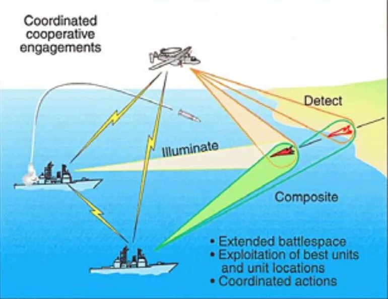 CECは、複数の艦船や航空機でレーダーなどにより追跡・捕捉された目標情報を、高容量ネットワークを通じてリアルタイムに融合・分配し、共通目標を算出することで、遠隔交戦を可能にする支援システムである。軍艦に搭載されたレーダーは、地球の曲率(地球の球体形状によって生じる曲線)のため、低高度で水平線を超えて飛来する巡航ミサイルが接近した際に捕捉が可能となる。