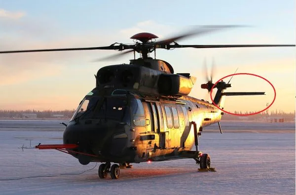 The horizontal stabilizer is part of the helicopter’s tail assembly and serves to maintain balance during flight.